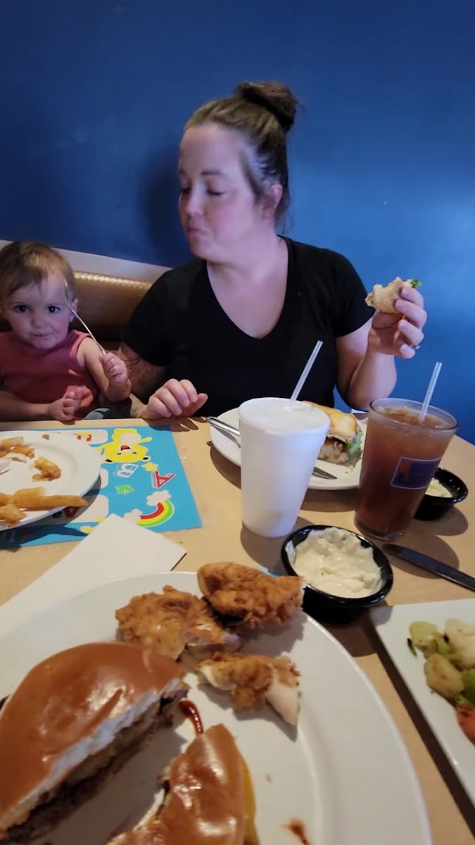 The tenderloin was very good and large! Fries were tasty. Husband had the 50/50 which is half burger/half bacon! Being a bacon nut, he really enjoyed it. The grandson had the chicken tenders. There were 3 really large pieces. There was more there than what you would get from a full chicken breast. He loved them and almost cleaned his plate. He liked the fries and mac and cheese also, as his meal came with 2 sides. The quality and quantity of the food was WELL worth the price. This was our first time here as we were passing through town. Would definitely stop again if we get back in the area. The service was spot on as well.