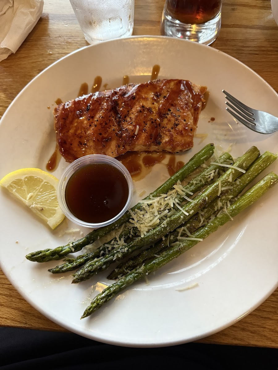 The salmon and sweet potato waffle fries with Carmel and mixed veggies is delicious. My wife loves the boom boom shrimp. The Campfire Cheesecake was so good. 4 of us split it!